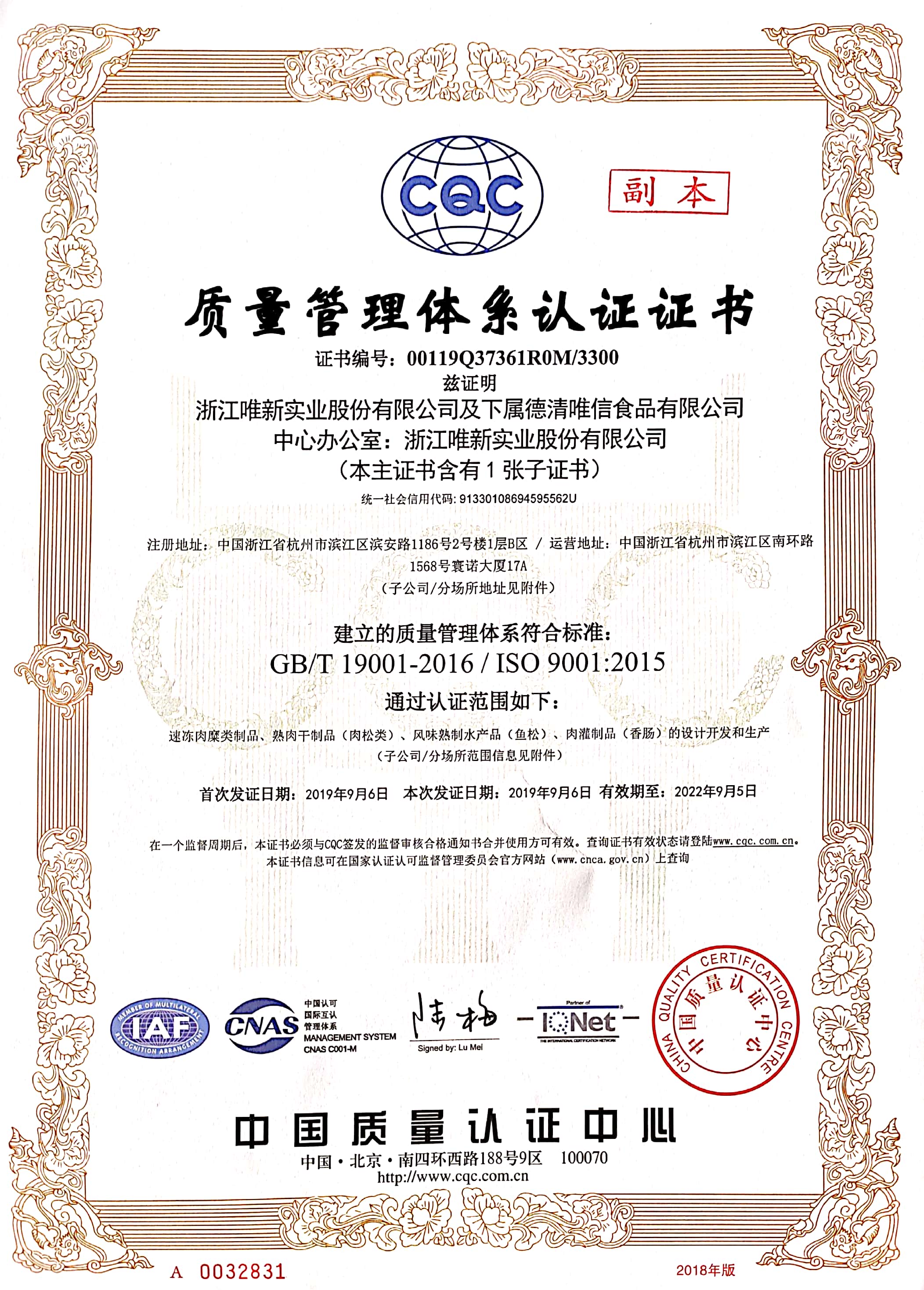2007年唯新食品被評為浙江名牌產(chǎn)品;唯新商標(biāo)被評為“浙江省著名商標(biāo)”。