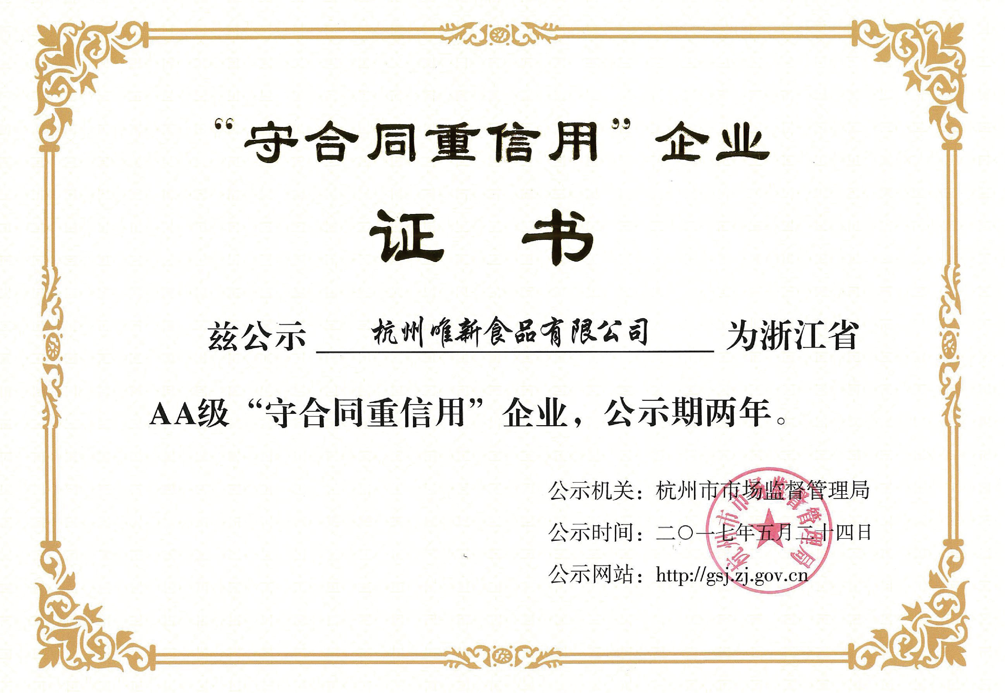 浙江省AA級(jí)“守合同 重信用”企業(yè)